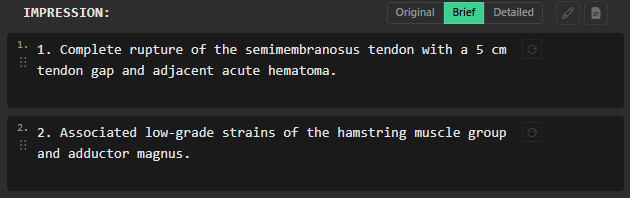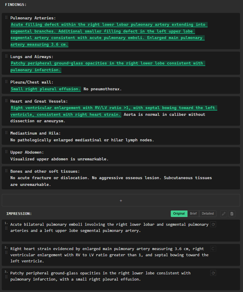 Dictate your full report as usual but skip the impression. RadPal reads your findings and generates a concise impression to complete it.