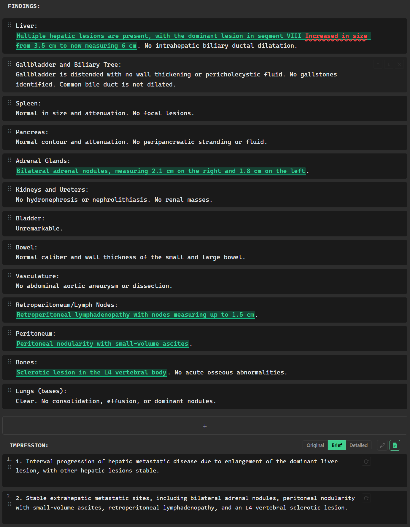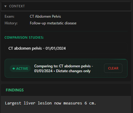 Load a prior, dictate only the changes, and let RadPal handle the rest. Stable findings carry over automatically.
