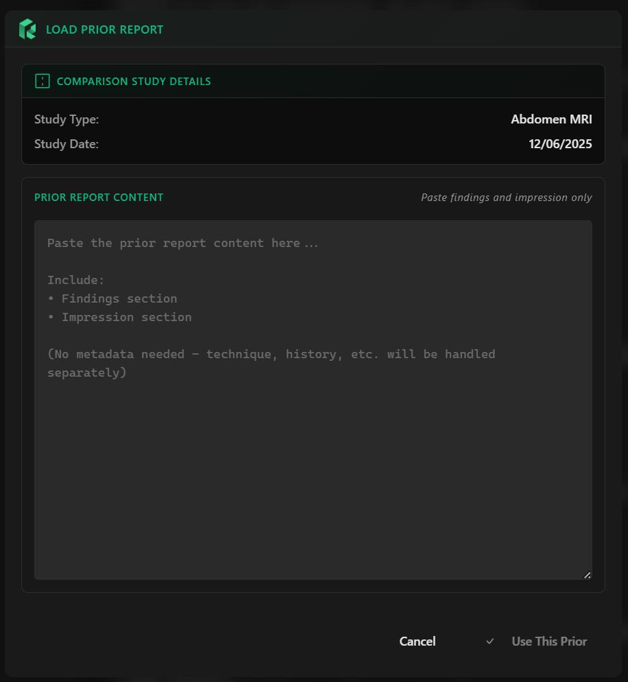 Paste a prior report's findings and impression. RadPal strips temporal language to create a clean baseline.